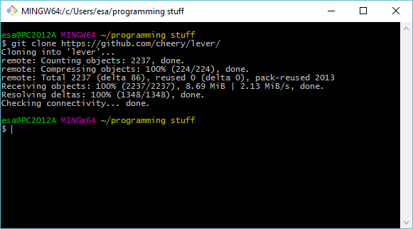 The git clone created a lever repository to where you issued it. Next you should 'File' -> 'Open Folder' to get it into your editor: