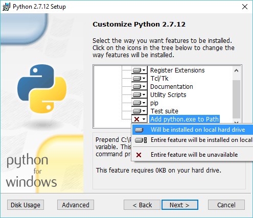 It's good idea to configure python to add itself into the PATH. Although it may be you have to restart your computer to have the PATH rule go to effect.