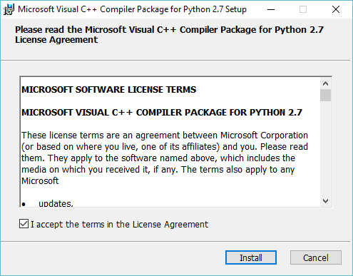 Next you need to download & install Microsoft Visual C++ Compiler for Python 2.7 The Microsoft tends to mess up their URLs from time to time. If the link doesn't work, do a search to find this installer. Just make sure it comes from Microsoft owned -url. Install it just like usual.