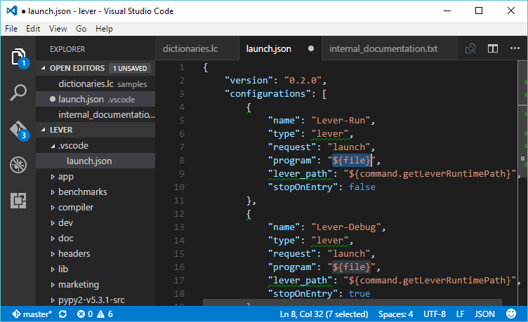 Put "${file}" into the "program" -option, so that the currently shown file gets run instead of the 'main.lc'. You may also like to change the "lever_path" into "${workspaceRoot}", because we are developing Lever.
