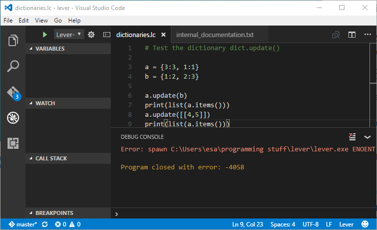 You should get this kind of ENOENT -error when you try to run your 'dictionaries.lc'. This happens because your runtime doesn't have lever executable yet.
