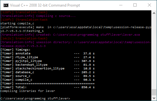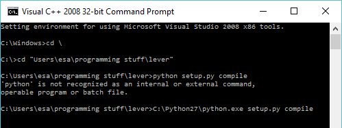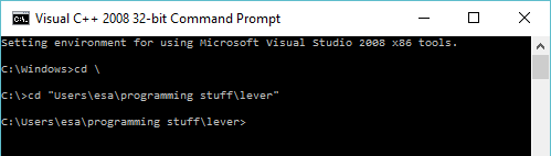 To do it, you will do that from the command line tool obtained two sections back. With the "Visual C++ 2008 32-bit Command Prompt". Navigate to your lever directory with a 'cd' -command.