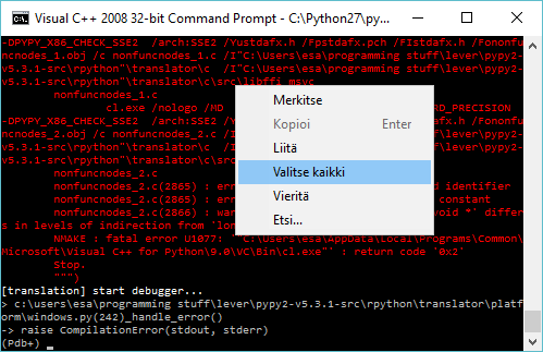 Next thing is important as RPython cannot translate to 64-bit executables on Windows, and it depends on bit-width of the Python. You need to download the "Windows x86 installer" from the download page that is for 32-bit environment. Also be sure that it is the Python 2.7 installer. The version number should appear in the start of the install.