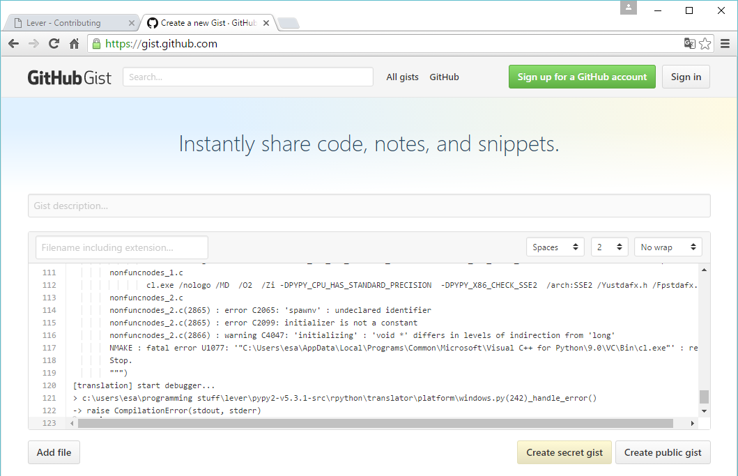 Go into gist.github.com and paste your error log there. Press 'create public gist'. You must be logged into github to do this. Any other pastebin site works as well.