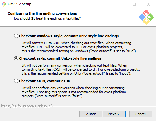 We recommend 'Checkout as-is' because this means you get a repository directory that is safe to move from a computer to an another without committing it through Git. You have an editor, that if you put like I proposed is configured to use LF everywhere. Also the VSCode doesn't force the file encoding so you shouldn't have problem with editing text files using any of the above settings.