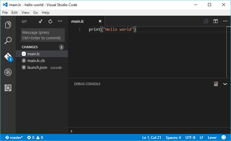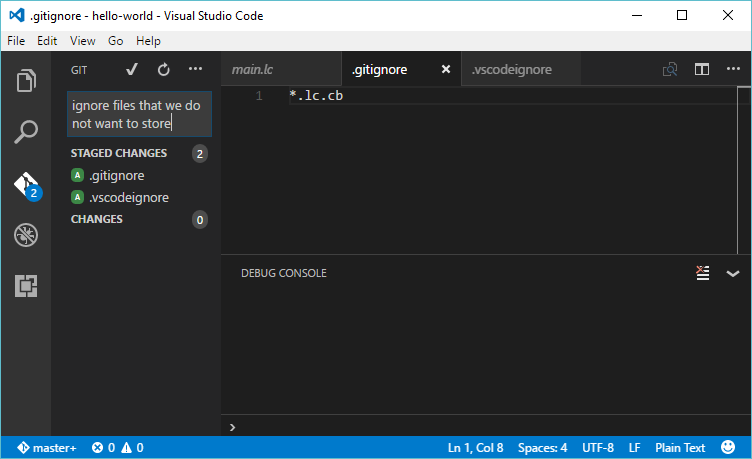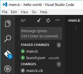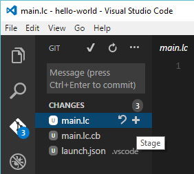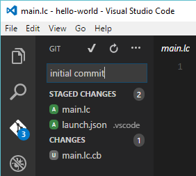 The staged changes appear into their separate list. We leave the main.lc.cb away because that's a binary file that Lever compiles from main.lc before it runs it.