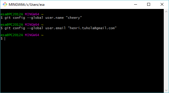 To avoid this, open the GIT Bash to get this kind of very discomforting black screen you've probably seen in hacking movies. Type the commands such as in the screenshot, but replace 'cheery' with user name of your own, and the email address with your own. These lines tag and identify the code you wrote.