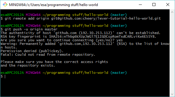 BOINK! Github hits you to the head! Well no. Actually it just denies your access to the repository because it cannot know it is yours. You need to authenticate.
